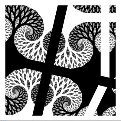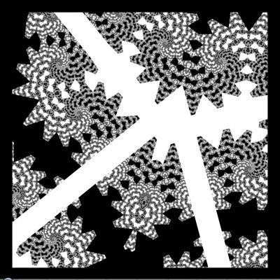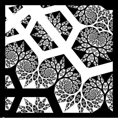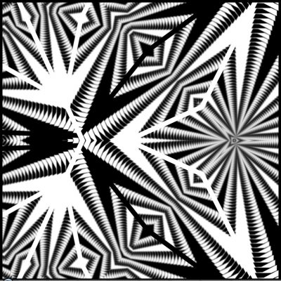 In these images, the ‘seed’ that is fed into the feedback is simply the plain black or white background of the window. There is a single rectangle rendered with the output of the previous frame as a texture, which is fed through a GLSL shader which inverts colour and applies a kaleidoscope effect, resulting in rich chaotic imagery.